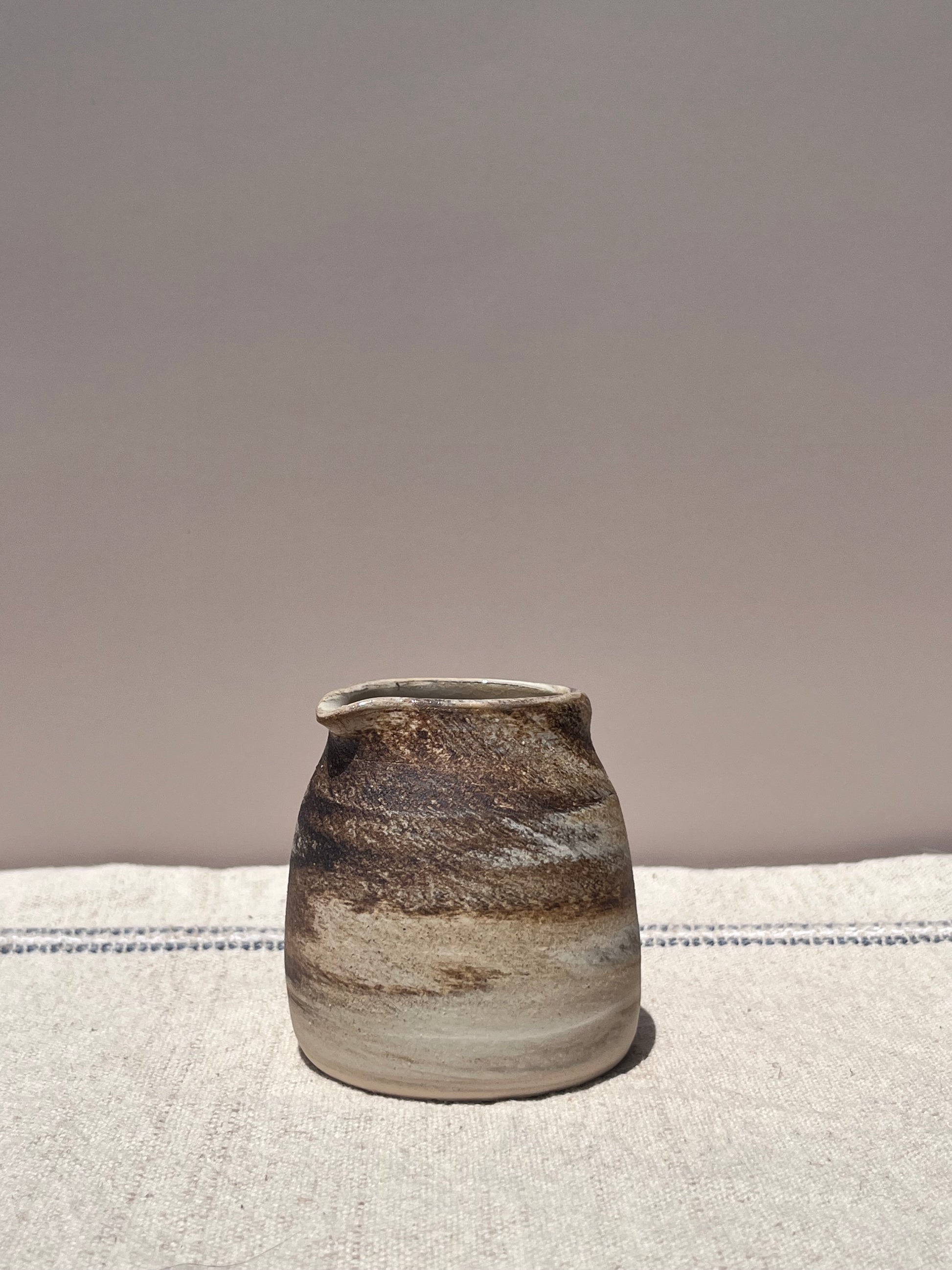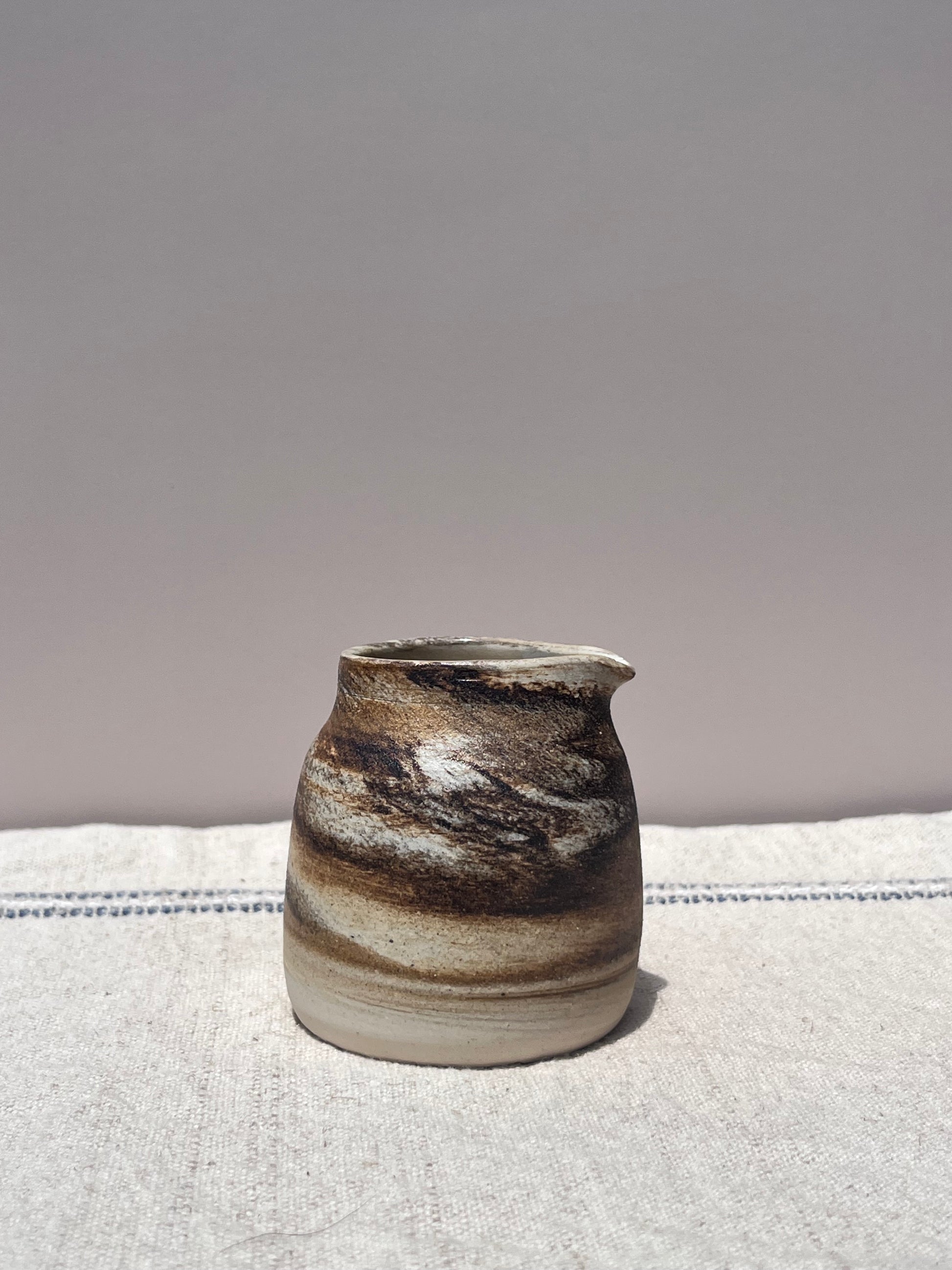 This small ceramic carafe is wheel-thrown and hand-finished, featuring rich, swirling earth tones that echo natural stone and wood grain. Perfect for pouring cream, syrup, or dressings, it brings rustic charm to your table with its organic lines and smooth glaze. Each piece is one-of-a-kind, with unique marbling and character from the firing process.