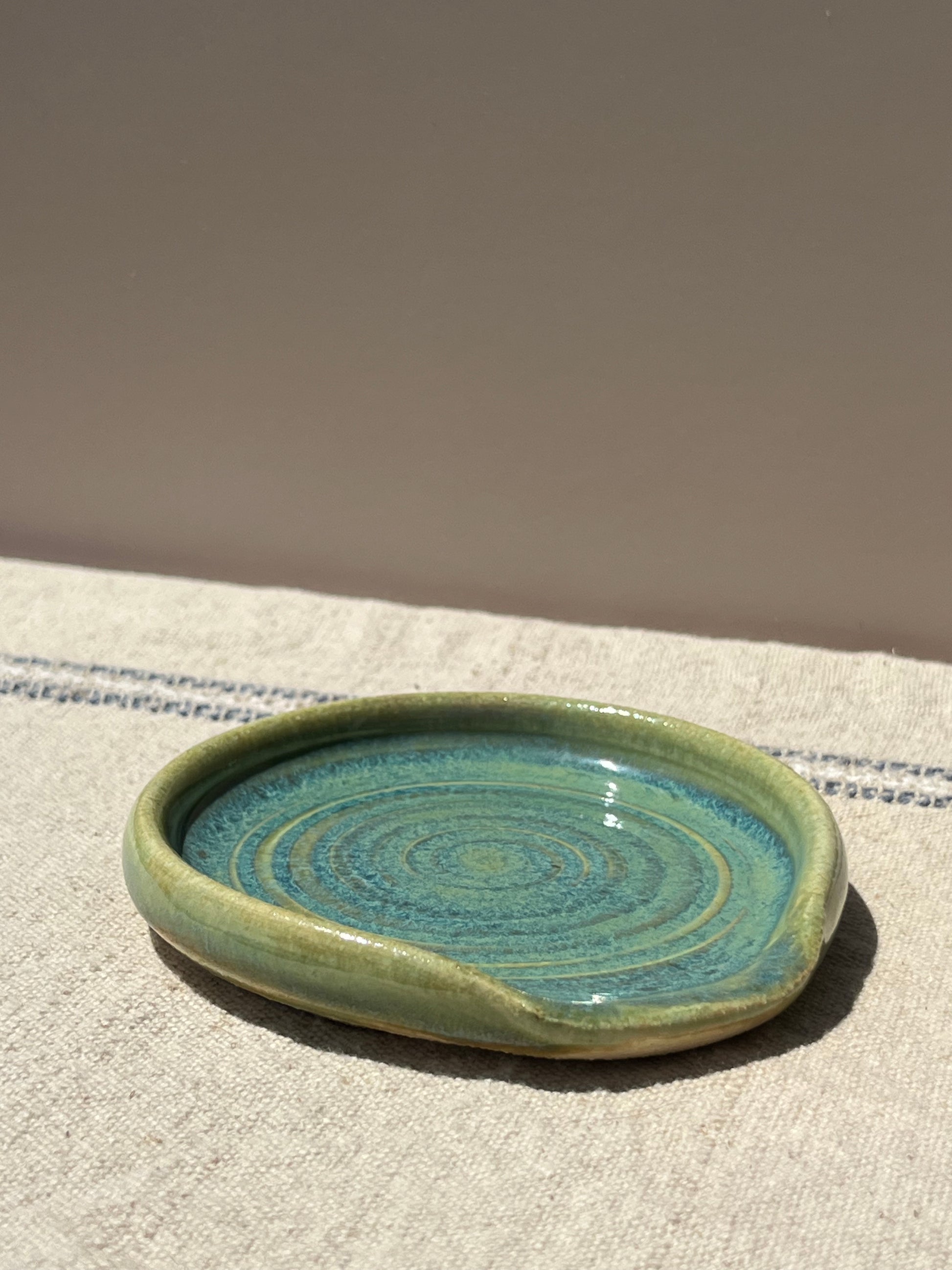 With colors drawn from windswept shores, this spoon rest features a soothing blend of sage green and pale ocean blue. The glaze melts softly over the rim and edges, pooling and flowing like sea mist over smooth stone.At its center, a subtle hand-carved spiral adds a quiet sense of movement—delicate, almost whispered into the clay. Thoughtfully crafted for daily use, it brings a sense of calm and coastal light to any kitchen space.