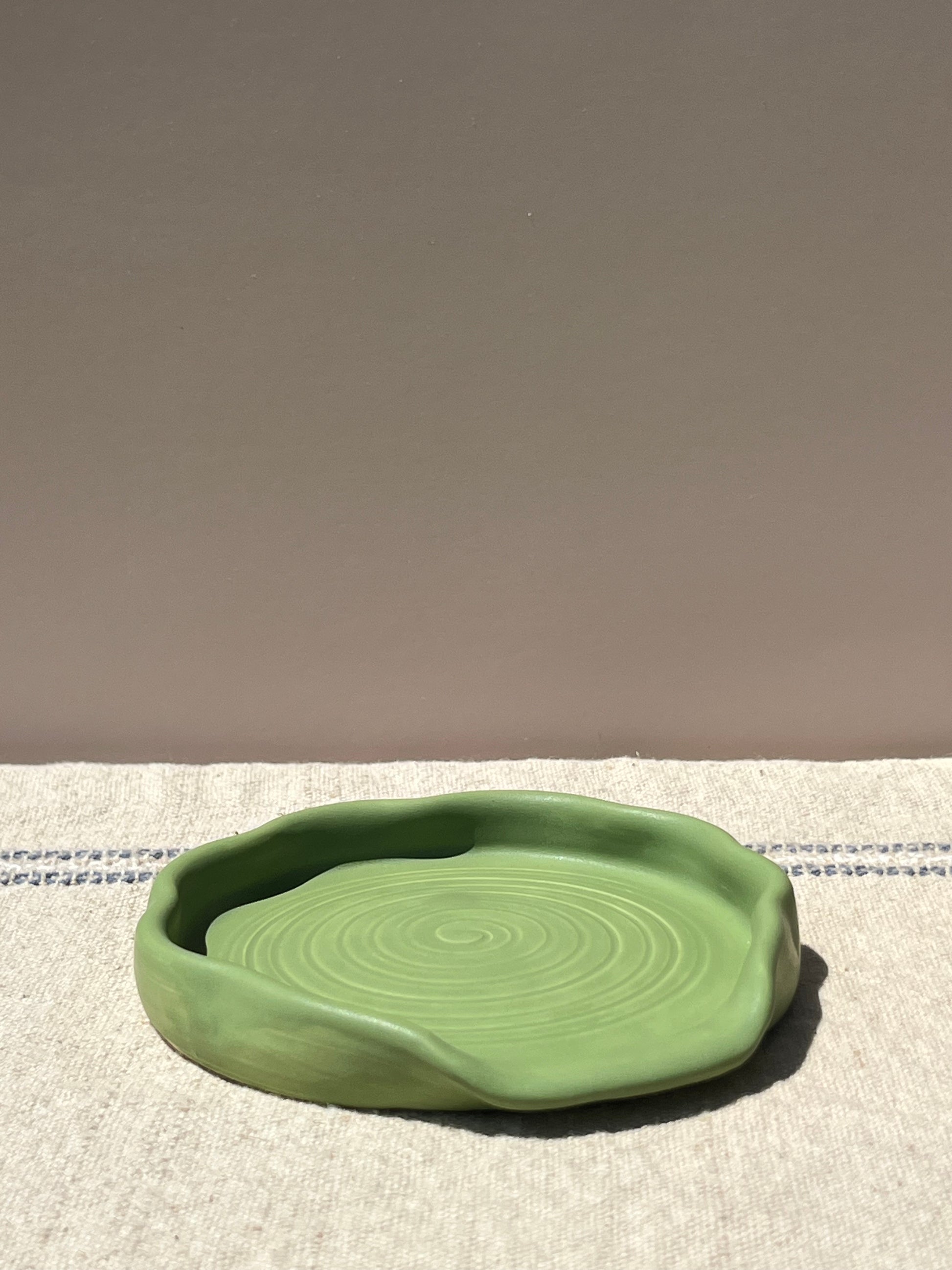 This spoon rest is finished in a matte jade glaze, smooth and grounding like cool river stone. Its scalloped edge recalls the gentle curves of a seashell or unfolding leaf, while a softly carved spiral at the center adds a quiet touch of movement. Organic, elegant, and functional—Verdant Shell brings the calm of the natural world into your everyday rhythm.